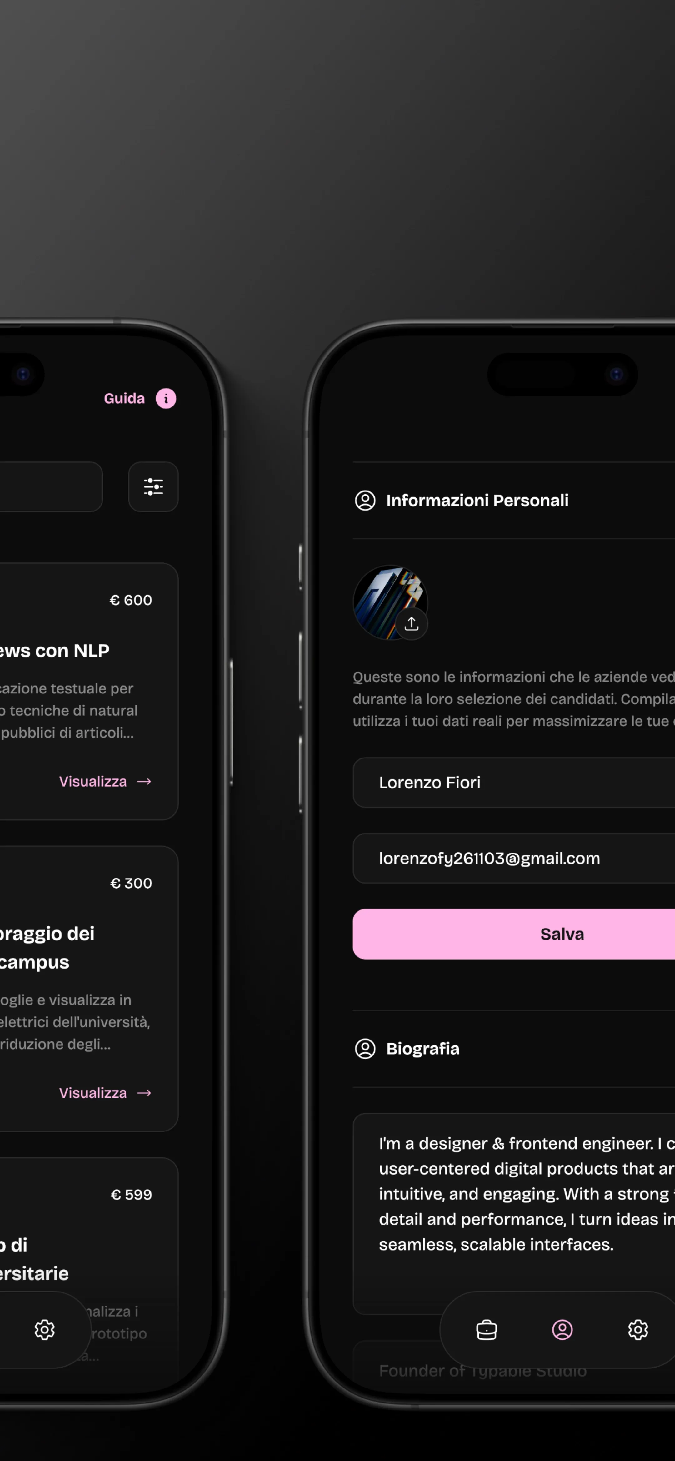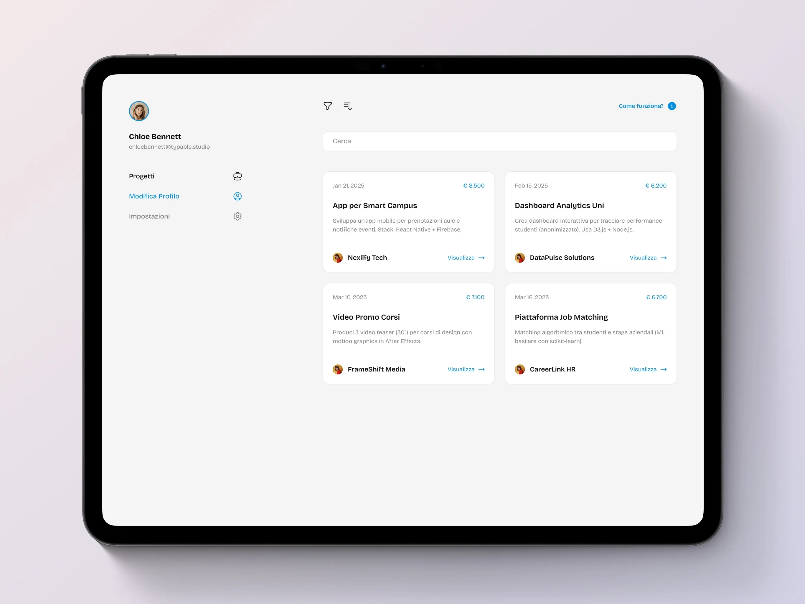 Stiamo lavorando per offrire una piattaforma innovativa che aiuterà gli studenti a trovare opportunità di lavoro concrete e pertinenti durante il percorso di studi, grazie a progetti reali in collaborazione con aziende. Il lancio ufficiale è previsto tra pochi mesi!